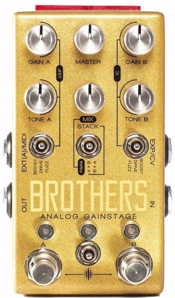 Designed in collaboration with Resonant Electronic™, Brothers™ is built upon two independent JFET / IC analog channels comprising a total of six unique boost, drive, or fuzz circuits in one small enclosure. The pedal can be routed in thirty-three distinct ways, including mixing them in parallel or changing the order of the effects. As with every Chase Bliss pedal, you can save everything and recall presets instantly, on-the-fly either on the pedal or with MIDI. Every knob and switch is connected to a little digital brain while your guitar signal stays 100% analog the entire time and never gets digitally processed.